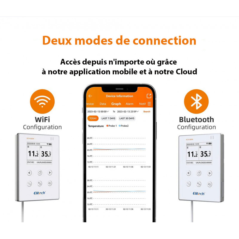 Découvrez le Elitech RCW-800W, un enregistreur de température wifi de haute précision conçu pour une surveillance continue et fiable des conditions environnementales. Grâce à sa connexion wifi et au cloud, vous pouvez surveiller à distance les températures et l'humidité en temps réel via une application mobile ou un navigateur web. Les alarmes instantanées par SMS et email vous permettent d'agir rapidement en cas de dépassement des seuils. Idéal pour les laboratoires, entrepôts, et environnements sensibles, cet enregistreur garantit la sécurité de vos produits grâce à ses fonctionnalités avancées et son interface utilisateur intuitive. Commandez dès maintenant pour bénéficier d'une surveillance optimale !